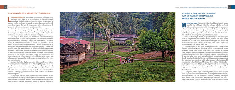 El diseño de este cuaderno es horizontal o apaisado (11x8.5 pulgadas), la hoja izquierda en español y la derecha en mayangna.